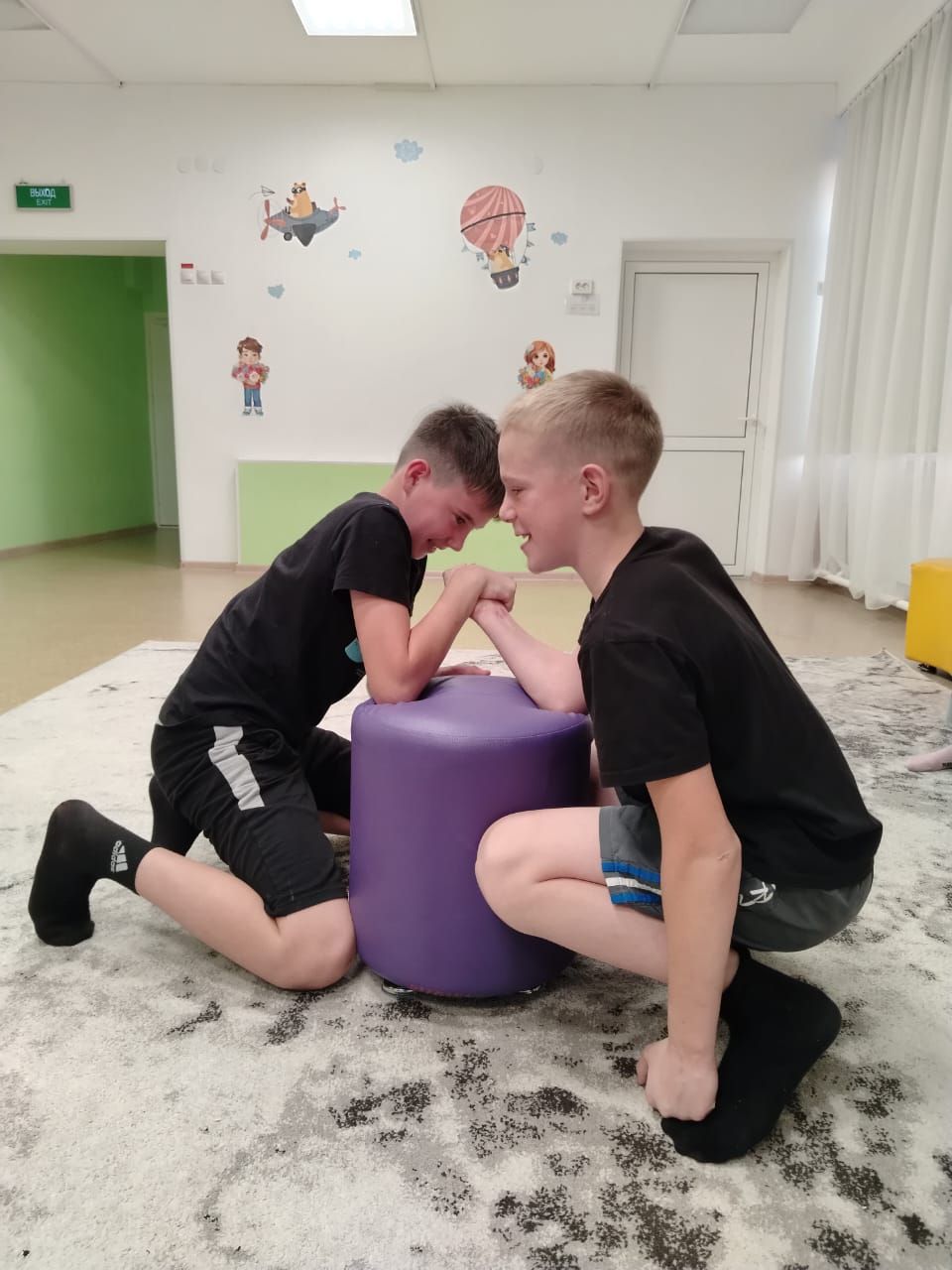 Зарядка с весёлыми упражнениями подняла настроение участникам. Затем начались настоящие олимпийские соревнования: бег, прыжки, эстафеты с мячом и обручем. Ребята также состязались в борьбе на руках.