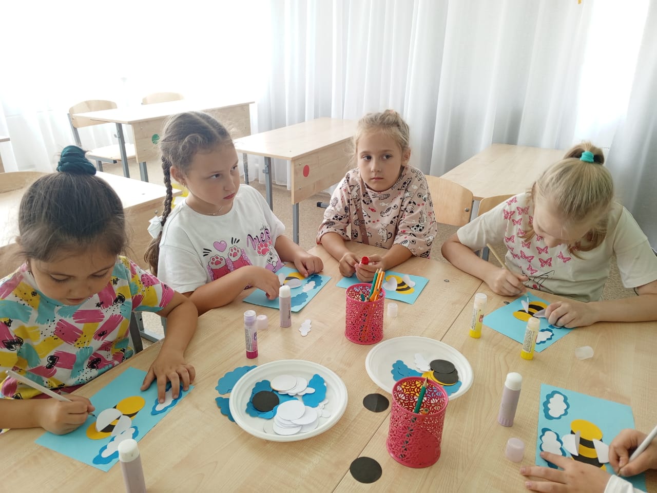 Ребята учились делать аппликации с элементами рисования. Это занятие развивает мелкую моторику, пространственное мышление, творческую фантазию, аккуратность и внимание.