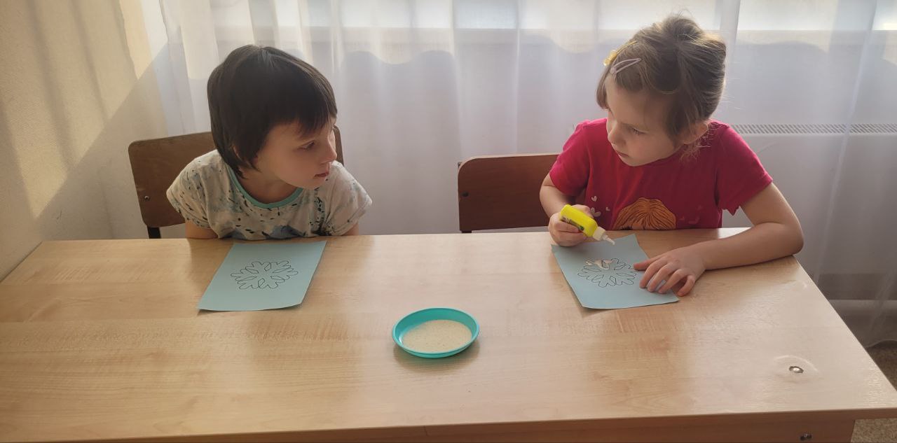 На занятии дети сначала создавали узор снежинки с помощью кисти и клея ПВА на бумаге, а затем засыпали его манной крупой. Это придавало снежинке объём и рельеф, после чего она «замораживалась» (застывала).