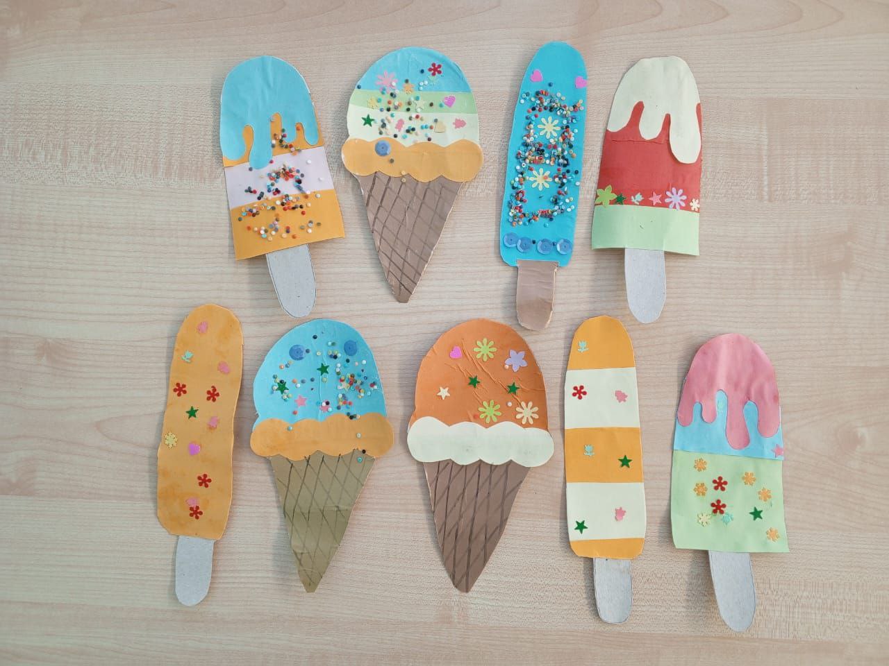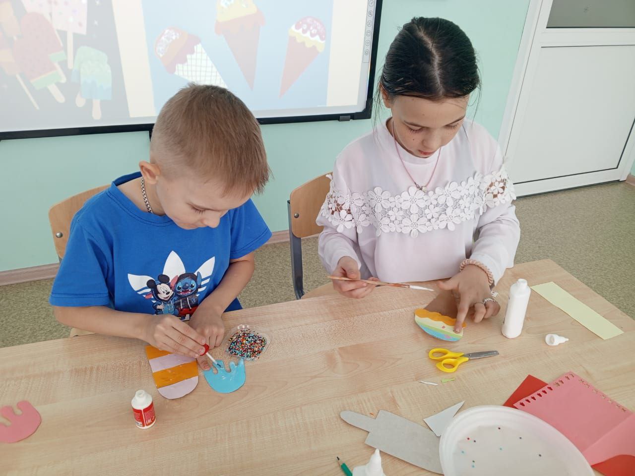 Чтобы закрепить тему, детям предложили создать своё мороженое в технике аппликации. Они проявили фантазию и творческий подход.