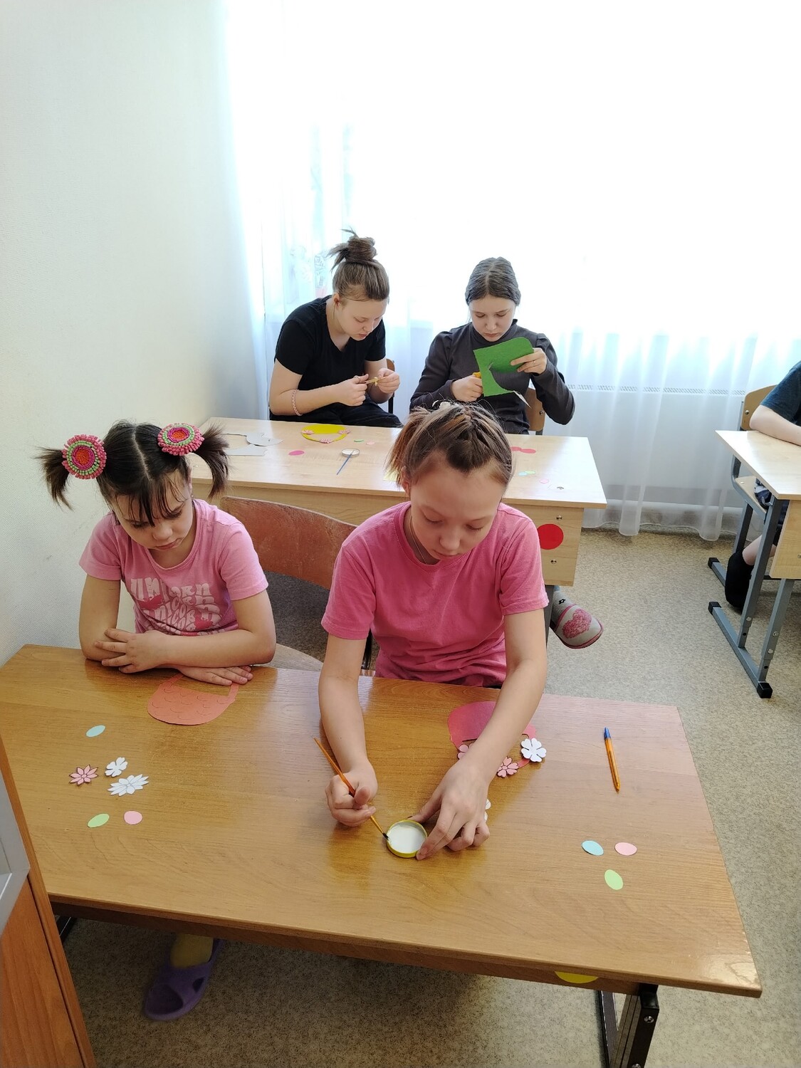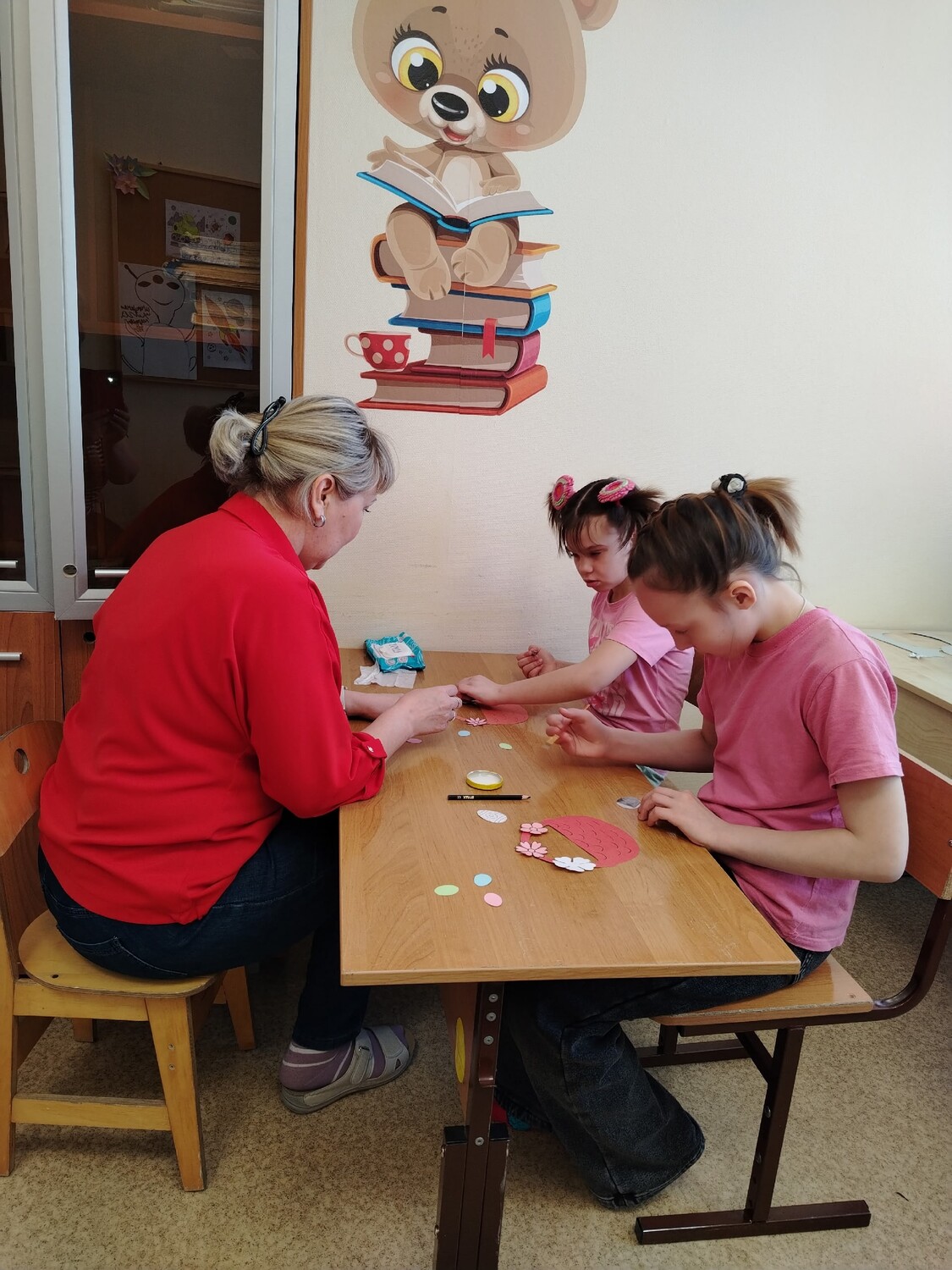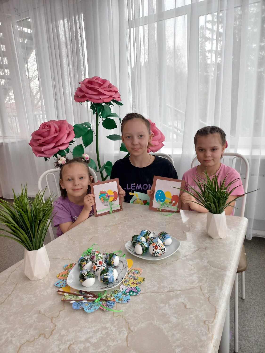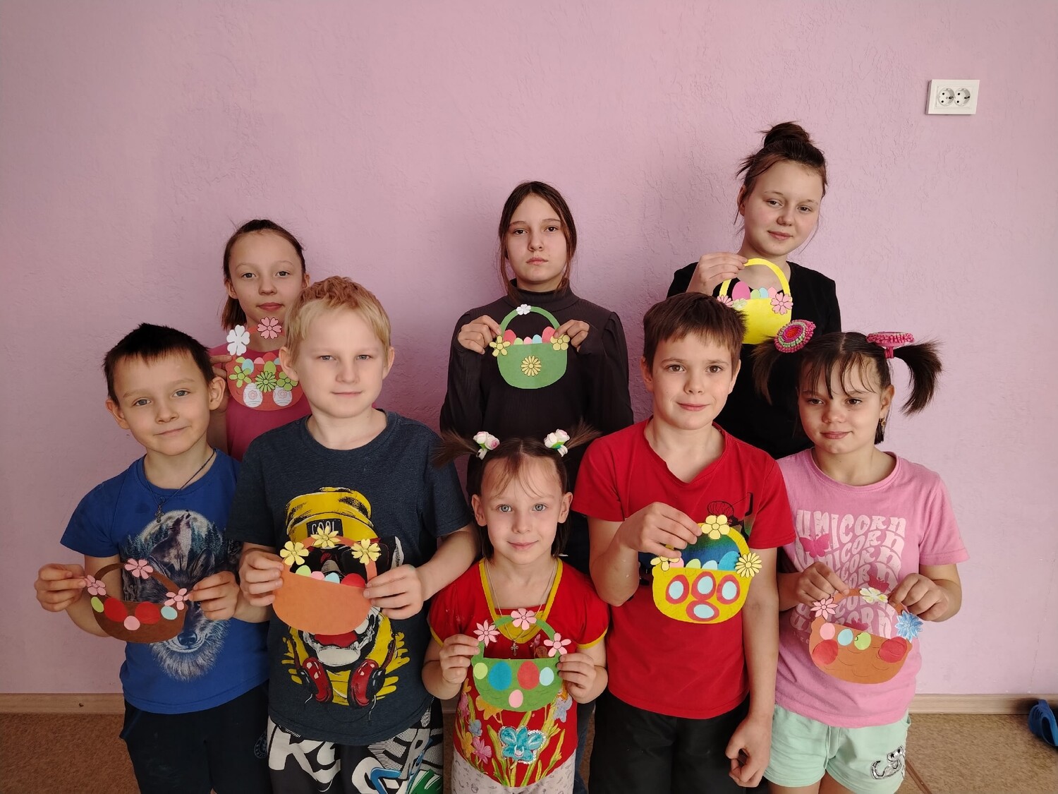 К этому дню дети из отделения социальной диагностики и реабилитации подготовили сувениры. Они создали аппликации. Сначала ребята с фантазией вырезали цветочки, яйца и корзинку.